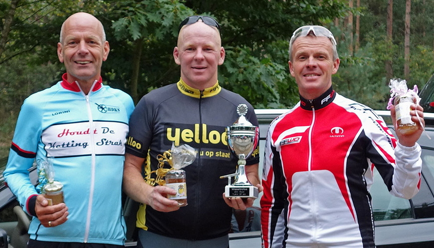 | 1 | Roberto van Goor * | 24.32 | 49.30 | Gortel, 7 september 2013. Hoe het stoppen met roken door Willy van Essen nog steeds invloed heeft op wielerclub “Houdt de Ketting Strak” uit Emst bleek zaterdag wel tijdens de “Zilveren Sigaret” tijdrit. Alweer voor de 37e keer werd deze langste tijdrit verreden. Redelijk najaarsweer zorgde aan het eind van de middag aan de Boshuisweg in Gortel voor veel drukte. Met 22 deelnemers was deze zware tijdrit over 32 kilometer goed bezet. Veel supporters bij start en finish. Ook veel fietsers op het parkoers, maar alles verliep zonder problemen. Er waren drie gastrijders die het alle drie bijzonder goed deden. Zo werd gastrenner Roberto van Goor bijzonder knap eerste in een schitterende tijd van 49 minuten en 30 seconden. Dat van Goor een tijdritrijder bij uitstek is was wel bekend, want vorig jaar greep hij net naast de titel en werd tweede. Nu was hij zelfs een minuut sneller. Een andere gastrenner, Henry van den Brink, wist beslag te leggen op de tweede plek. Gastrenner nummer drie, André Gijsendorffer, werd zeer fraai vijfde en verbeterde zijn tijd met 1 minuut en 16 seconden ten opzichte van vorig jaar. Een uitstekende prestatie werd geleverd door Houdt de Ketting Strak lid Wim Karman uit Vaassen. Met een prima tijd van 51 minuten en 15 seconden werd hij derde en met deze prestatie mag hij zich clubkampioen 2013 noemen. Bijzonder sterk was het rijden van Jolanda van der Ende bij de dames en werd eerste in deze categorie met een tijd van 56 minuten en 58 seconden. In het mannen geweld zou ze met deze tijd vijftiende geworden zijn. |